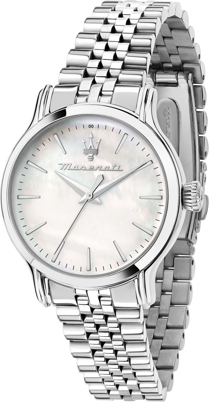 Kellon 34 mm ruostumattomasta teräksestä valmistettu runko on kestävä ja tyylikäs, ja sen hopeanvärinen muotoilu tuo esiin kellon modernin estetiikan. Vaalean sävyinen kellotaulu sekä indeksit ja osoittimet. Kellotaulussa näkyvä Maseratin ikoni heijastaa kellon luksusluonnetta ja huoliteltua viimeistelyä.