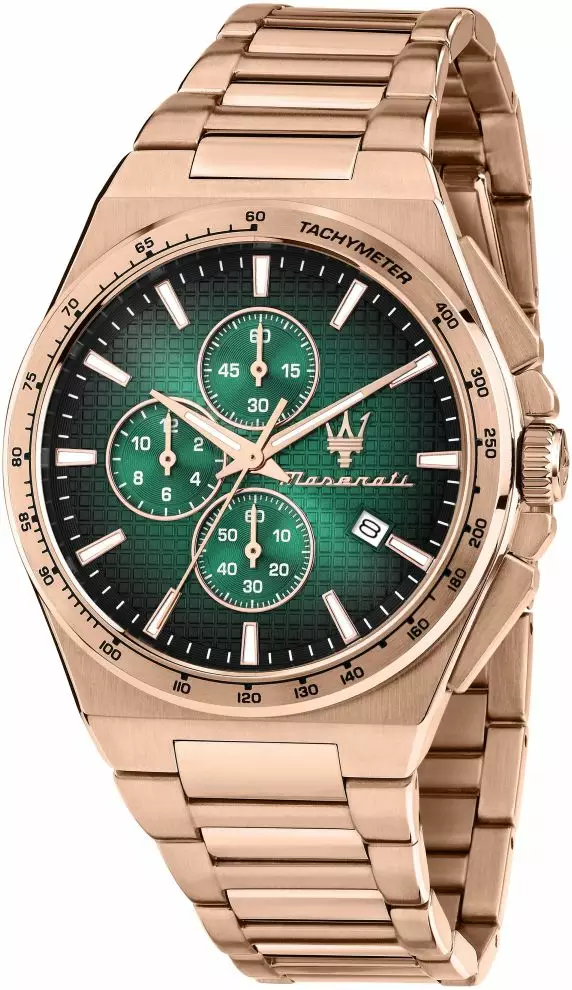 Kellon 41 mm halkaisijaltaan oleva ruostumattomasta teräksestä valmistettu kuori antaa ranteessa vahvan läsnäolon. Upea vihreän sävyinen kellotaulu säväyttää, ja ruusukullan sävyiset indeksit sekä osoittimet tasapainottavat hienosti. Kellossa on tyylikkäästi integroitu kronografitoiminto kolmella pienellä kellotaululla. Lisäksi vesitiiveys 10 ATM (100 m) mahdollistaa sen, että kello kestää päivittäistä käyttöä ja jopa uintia — urheilullinen elämäntyyli kohtaa tyylikästä muotoilua.