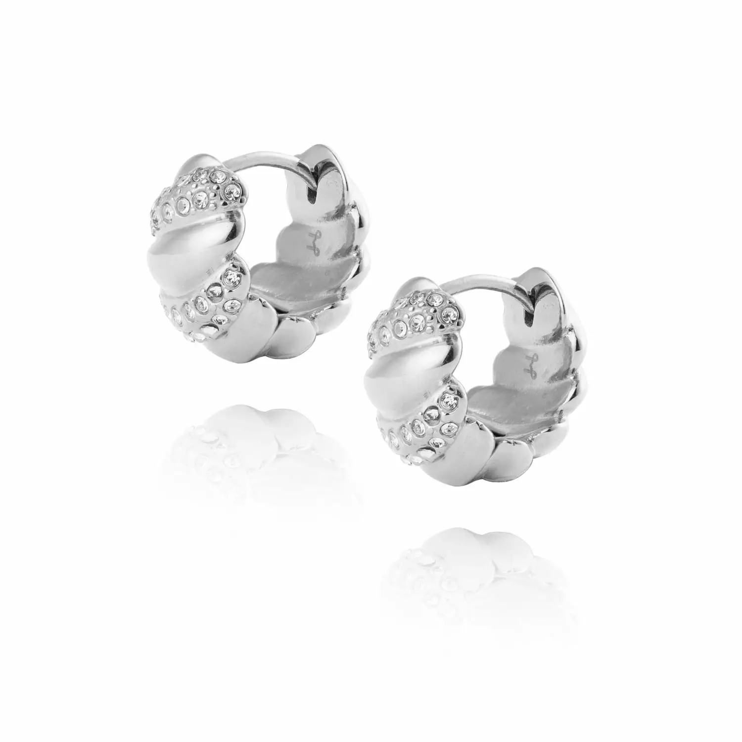 Mockberg Kenza Noela Medium -korvakorut teräksen sävyssä hurmaavat pehmeästi kierretyllä muotoilullaan, jossa sileät pinnat yhdistyvät pavé-istutettuihin kirkkaisiin Preciosa-kiviin. Viileän elegantti teräksen väri korostaa muotoilun puhtaita linjoja ja antaa korvakoruille raikkaan, ajattoman ilmeen, joka heijastaa valoa hillityn kauniisti.