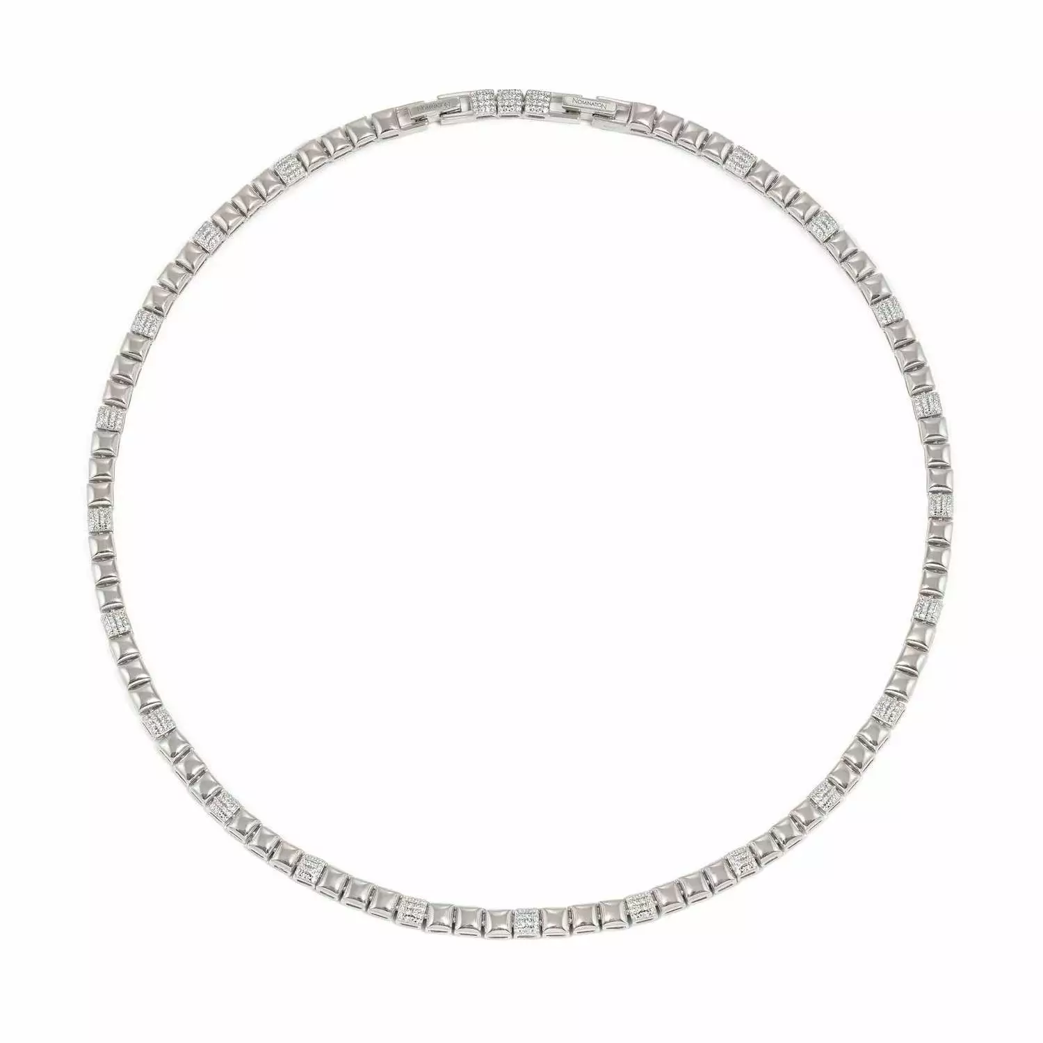 Hopeinen Nomination kaulakoru kimaltelevilla zirkoneilla, jotka on istutettu koruun -pavé-istutuksella. Korun pinta on viimeistelty rodinoinnilla, joka antaa korulle kauniin sävyn. Korun muotoilussa yhdistyvät sulavat linjat ja modernit geometriset elementit, luoden hienostuneen mutta kevyen kokonaisuuden.