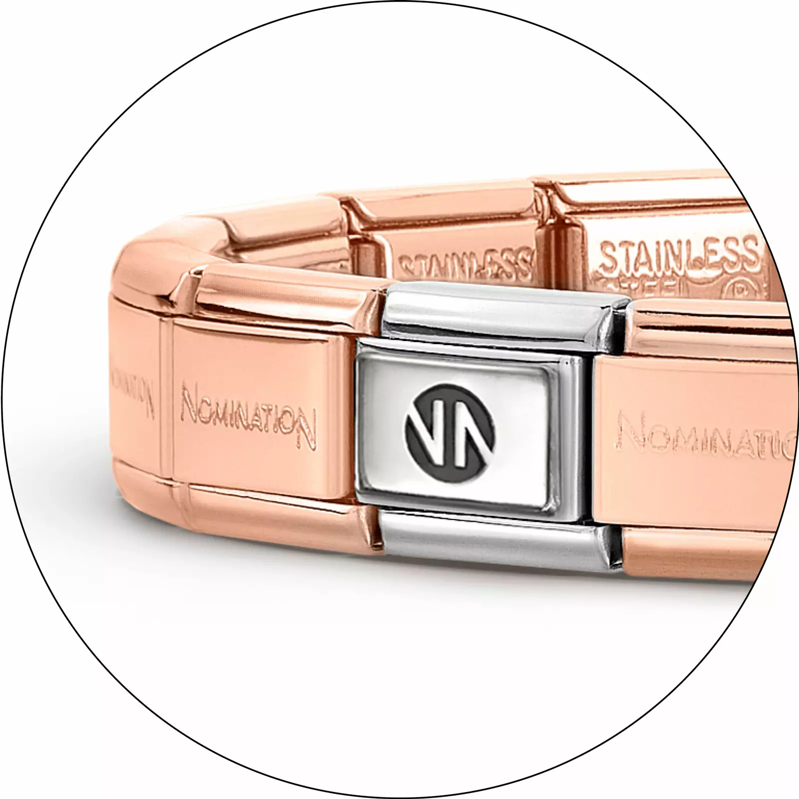 Nomination palojen aloitusranneke, joka useasta ruusukullan väriseksi käsitellystä teräspalasta ja yhdestä hopeisesta Nomination -logopalasta.