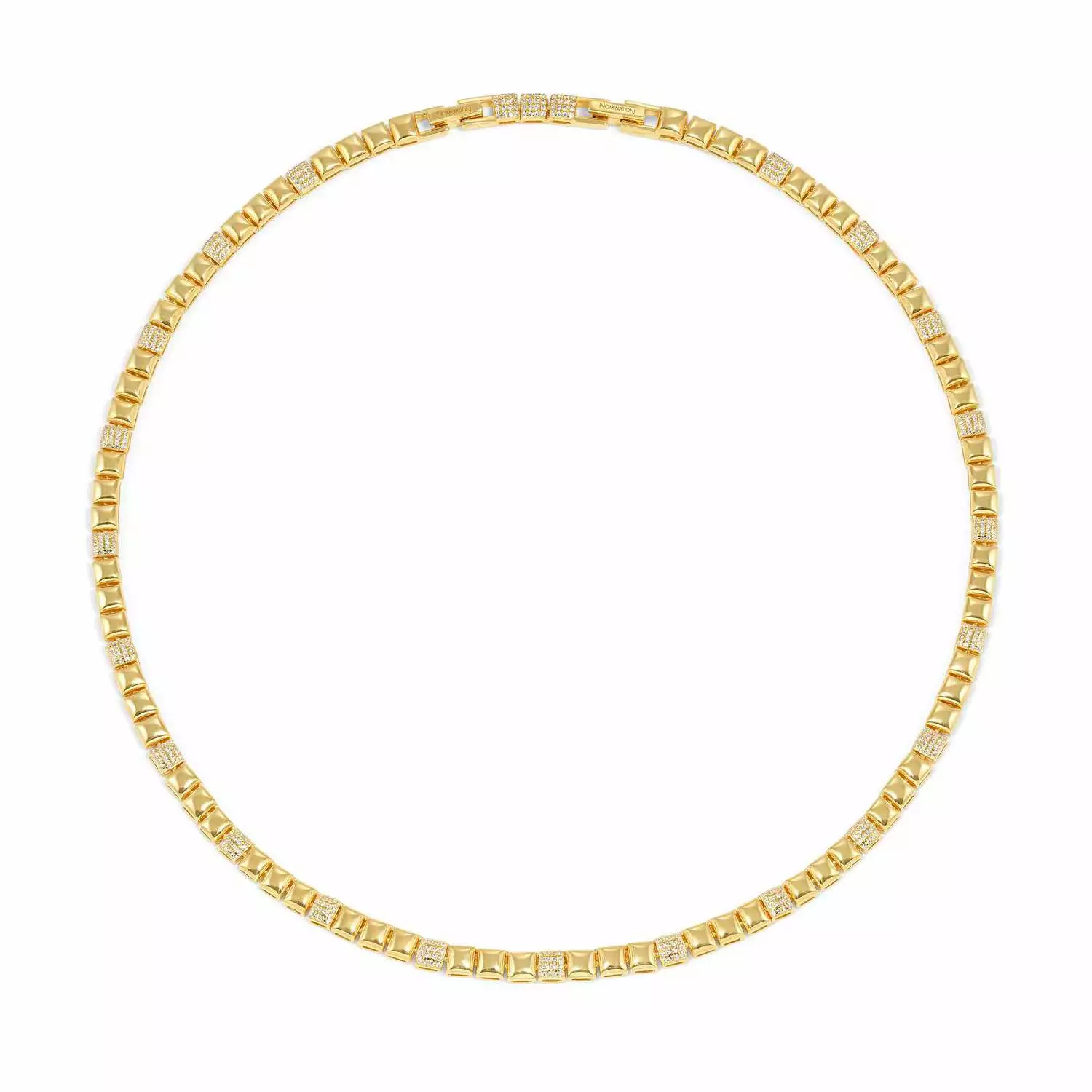 Hopeinen Nomination kaulakoru kimaltelevilla zirkoneilla, jotka on istutettu koruun -pavé-istutuksella. Korun pinta on viimeisteltyja ylellisellä keltakultasävyisellä viimeistelyllä, joka on toteutettu galvanointiprosessilla. Korun muotoilussa yhdistyvät sulavat linjat ja modernit geometriset elementit, luoden hienostuneen mutta kevyen kokonaisuuden.