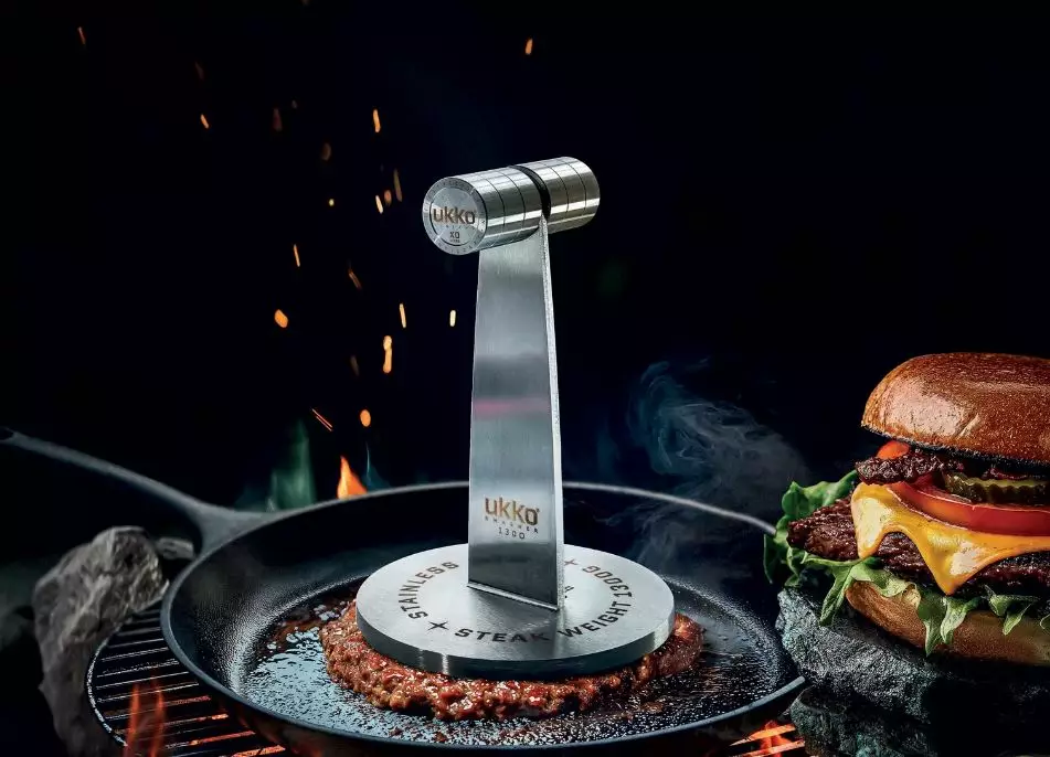 Teräksisen Ukko Smasherin kokonaispaino on muhkeat 1,3 kg, jonka sorvattu umpiteräksinen kahva takaa tukevan otteen eikä kuumene käytössä. Täydellisen lopputuloksen takaa prässin sileäksi hiottu pohjaosa, joka on hitsattu varteen käsityönä. Tukeva pohjakiekko smäshää pihvilihan varmasti ja tekee täydellisen smash burger pihvin. Kiekon halkaisija on 120mm ja paksuutta löytyy arvostettavat 8mm.